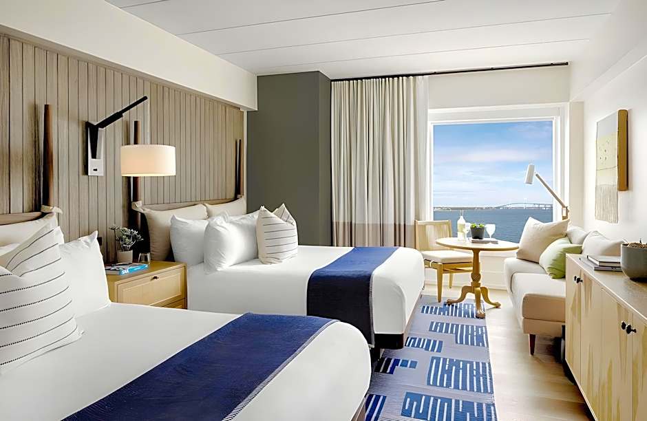 • Our Narragansett rooms are located in the Captain’s Quarter’s wing, providing a quiet and serene retreat near the Island Pavilion and Bayview Lawn. The Narragansett Two Queen rooms are approximately 150 sq. ft. larger than the Harbor Two Queen rooms and offer a blend of modern comfort and natural beauty - a perfect sanctuary for your seaside getaway. The plush queen-size beds are adorned with crisp, white linens, reminiscent of ocean waves breaking on a pristine shore. Along the wall, a statement driftwood-inspired headboard infuses the spaces with a touch of warm, coastal elegance. The cozy seating area beckons you to unwind, featuring a comfortable sofa and surrounded by carefully curated artworks. Enjoy a spa-like bathroom adorned with luxurious amenities, sleek marble, and nautical accents.